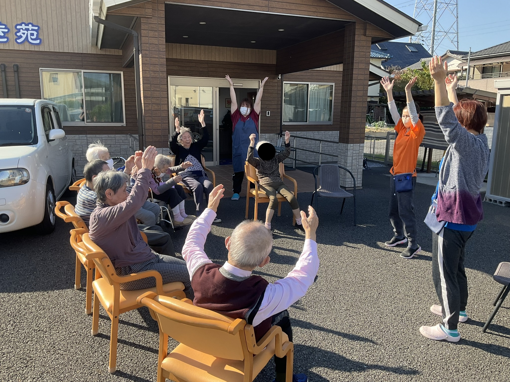 さて、今日は天気も良いのでみんなで外に出て体操をしました。